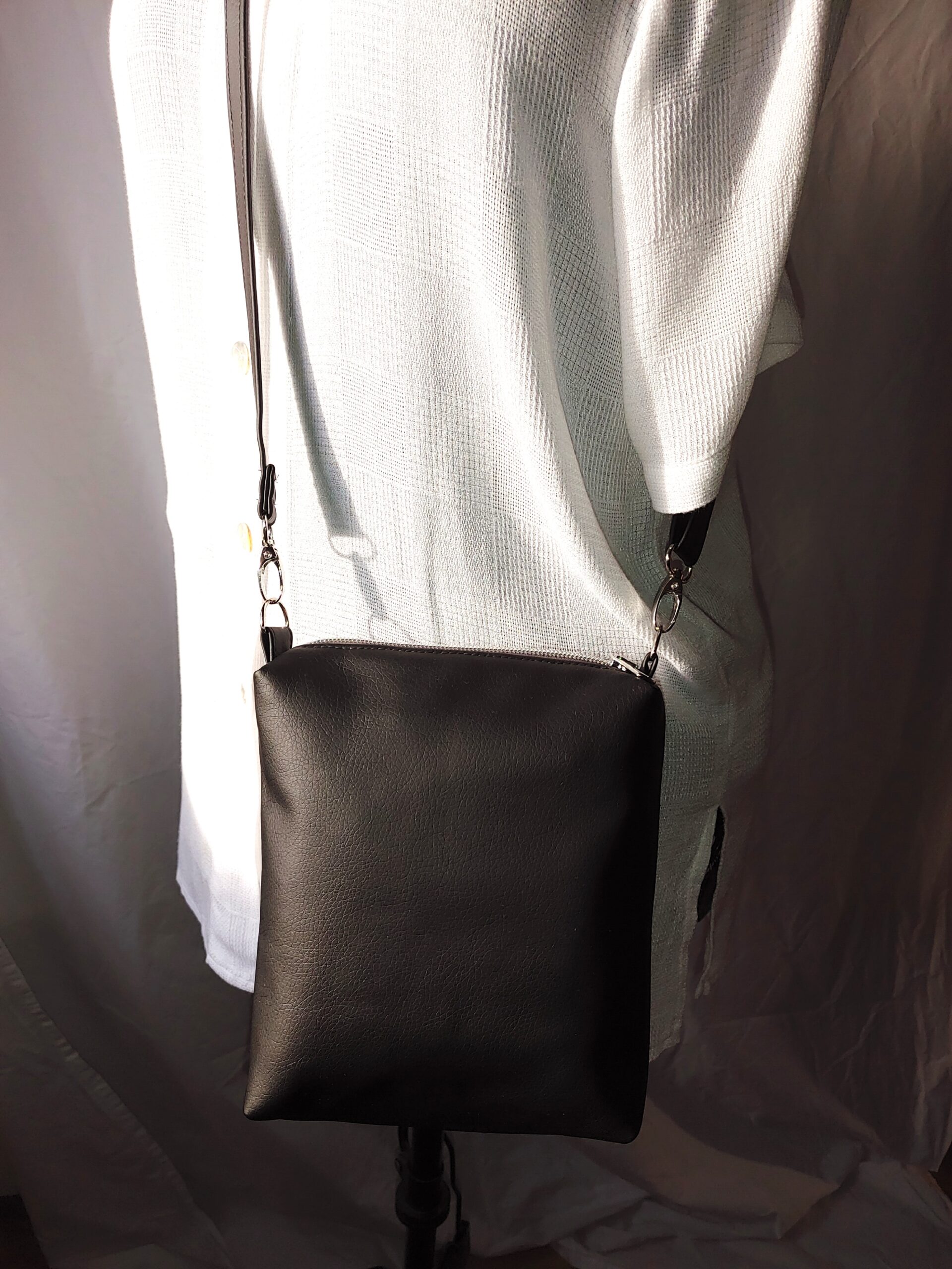 Kleine handgenähte Umhängetasche aus schwarzem, glattem Kunstleder und abgenähten Ecken, mit silberfarbener Hardware und Baumwollfutter mit Leo-Print. Innen ist sie mit Reißverschluss- und Steckfach ausgestattet. Sie hat einen verstellbaren, schmalen Gurt – bequem über der Schulter oder crossbody zu tragen.