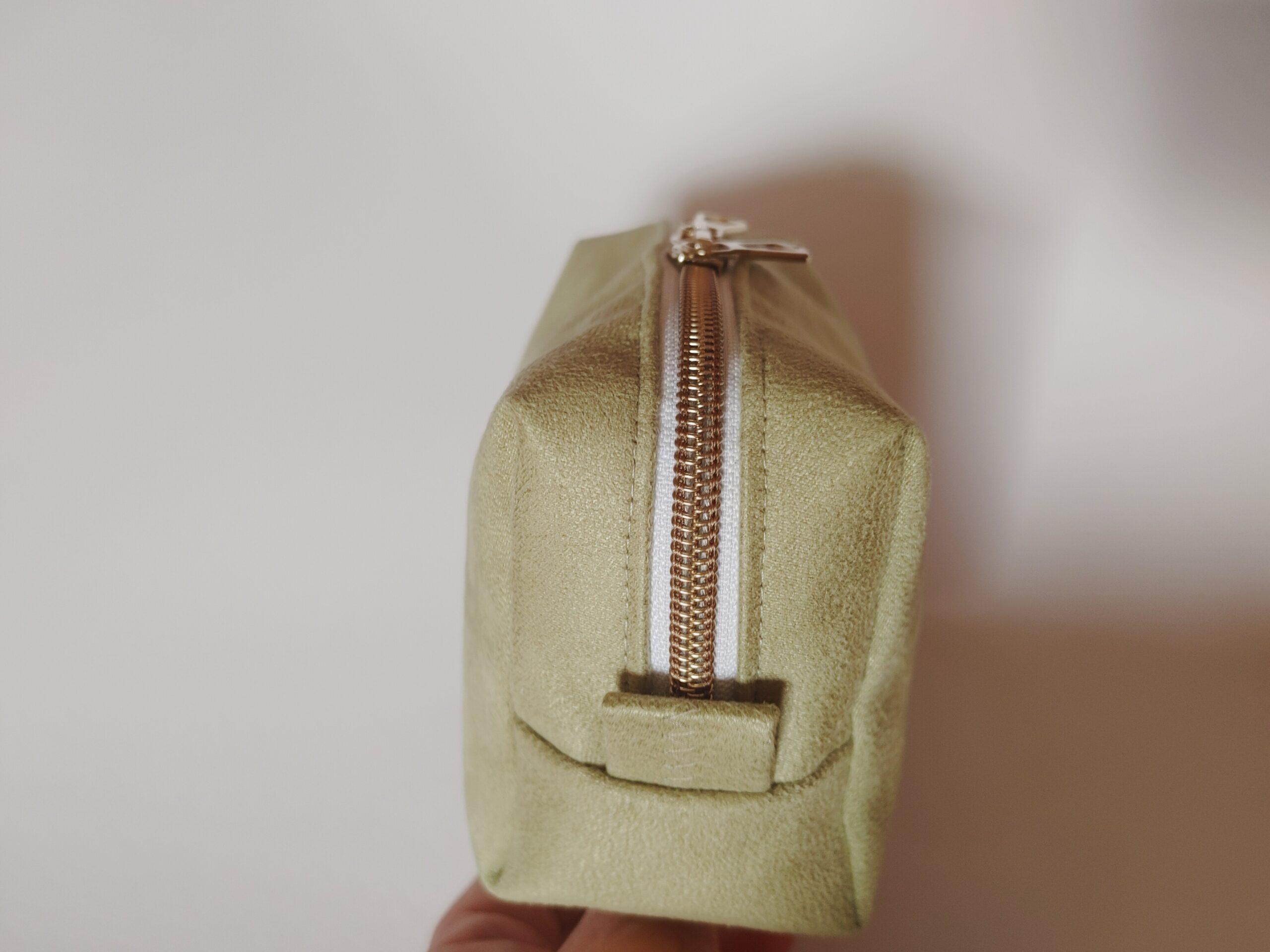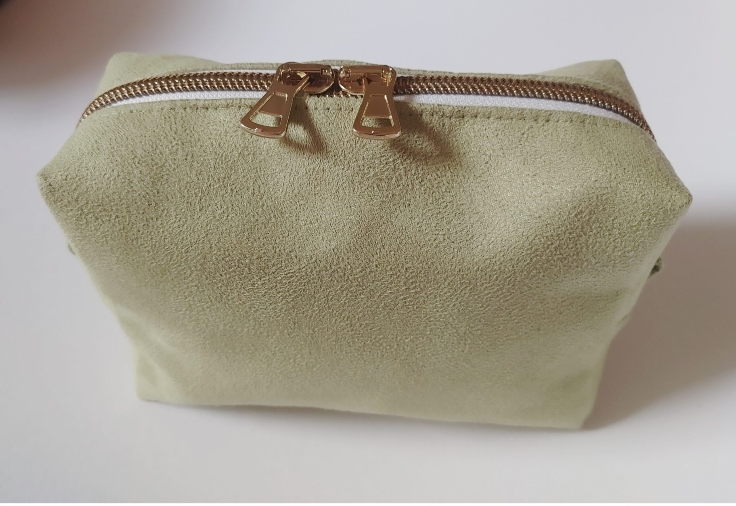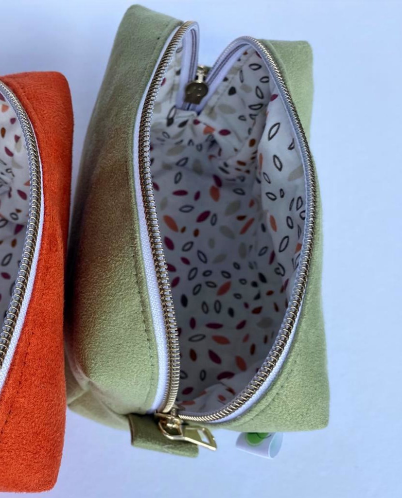 Diese liebevoll genähte Kosmetiktasche begeistert durch ihre zarte Farbgebung und das edle, schlichte Design. Das angeraute Kunstleder in Lindgrün erinnert mit seiner softmatten Oberfläche an feines Wildleder – angenehm weich im Griff und gleichzeitig formstabil.